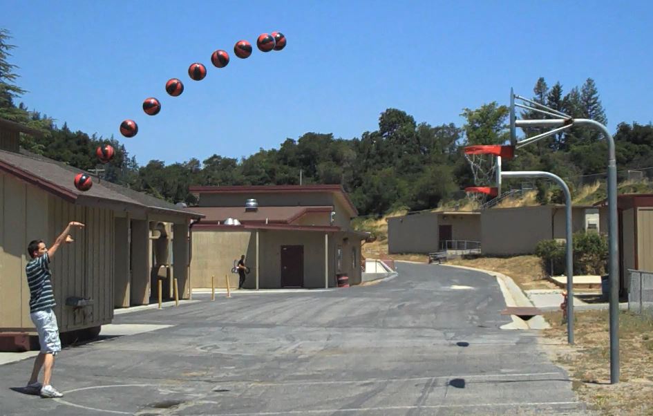 We started with Dan Meyer‘s Will It Hit the Hoop? concept, slightly modified. Showed Act 1 video, but captured this picture for analysis.