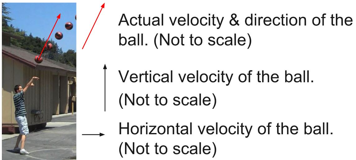 But Dan did not throw the ball only horizontally or only vertically. He threw it at an angle – so that it could reach the hoop, presumably. So I asked the question: “What was the launch velocity of the basketball?” and accompanied the question with this image: