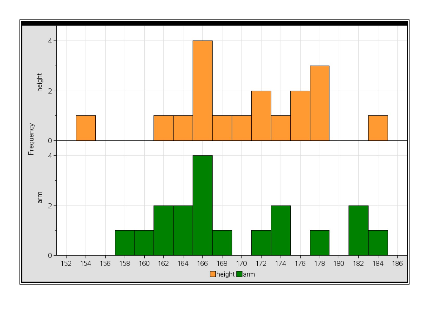 The easiest way to dig into this question is to look at a scatter plot of the data. So, we plotted the variables, along with the line height = arm span.